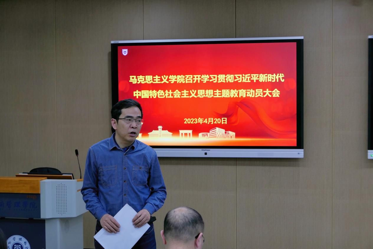 The Nanjing University (NJU) School of Marxism held a mobilization meeting for the thematic education campaign to study and implement Xi Jinping Thought on Socialism with Chinese Characteristics for a New Era on the afternoon of April 20. Members of the Party and administration leading group, teachers who are Party members, and the Secreatary of the Student Party Branch of the School of Marxism attended the meeting. Hu Daping, dean of the School of Marxism, presided over the meeting.