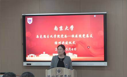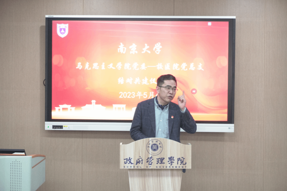 On the afternoon of May 4, 2023, which marked Youth Day, the CPC Committee of Nanjing University (NJU) School of Marxism and the General Party Branch of Nanjing University Hospital held a ceremony of pairing-up and co-building on NJU Xianlin Campus. Over fifty people attended the event, including Tang Shaoqiu (secretary of the General Party Branch and the Director of Nanjing University Hospital), Cheng Hao (deputy secretary of the General Party Branch and deputy director of Nanjing University Hospital), Sun Xiufang (deputy director of Nanjing University Hospital), Wang Jianhua (secretary of the CPC Committee of NJU School of Marxism), Hu Daping (dean of NJU School of Marxism), as well as representatives from both organizations who are members of the Party. Shi Yu, the deputy secretary of the CPC Committee of NJU School of Marxism, presided over the ceremony.