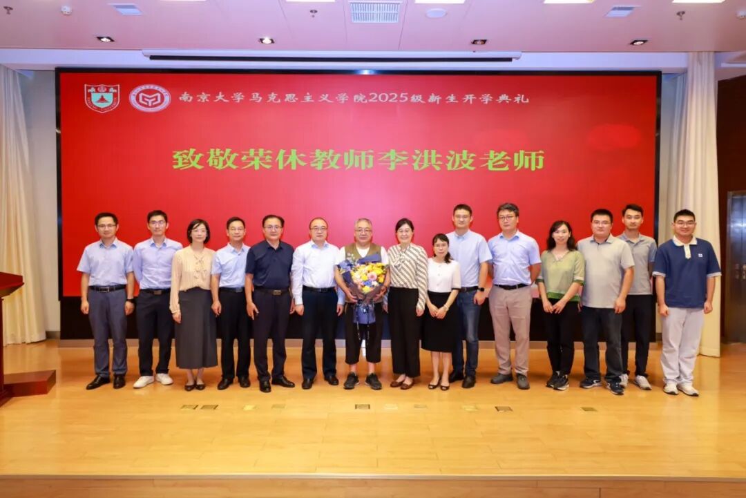 典礼进入温馨而庄重的荣休教师寄语环节。荣休教师李洪波老师讲述了自己与南大之间长达四十载的故事,并向同学们分享了“不强求,不放弃,常给心放假”的人生寄语。他强调,“不强求”是指要避免因不切实际的执着而自寻烦恼;“不放弃”则是说人不能因此躺平,同时仍需保持生活与工作的目标感,呼吁同学们要成为脚踏实地、言谈务实的高层次人才,并表达了对同学们学习与生活的美好祝愿。随后,在悠扬的音乐中,员工代表向李洪波老师献花,学院教师代表们与李洪波老师合影。