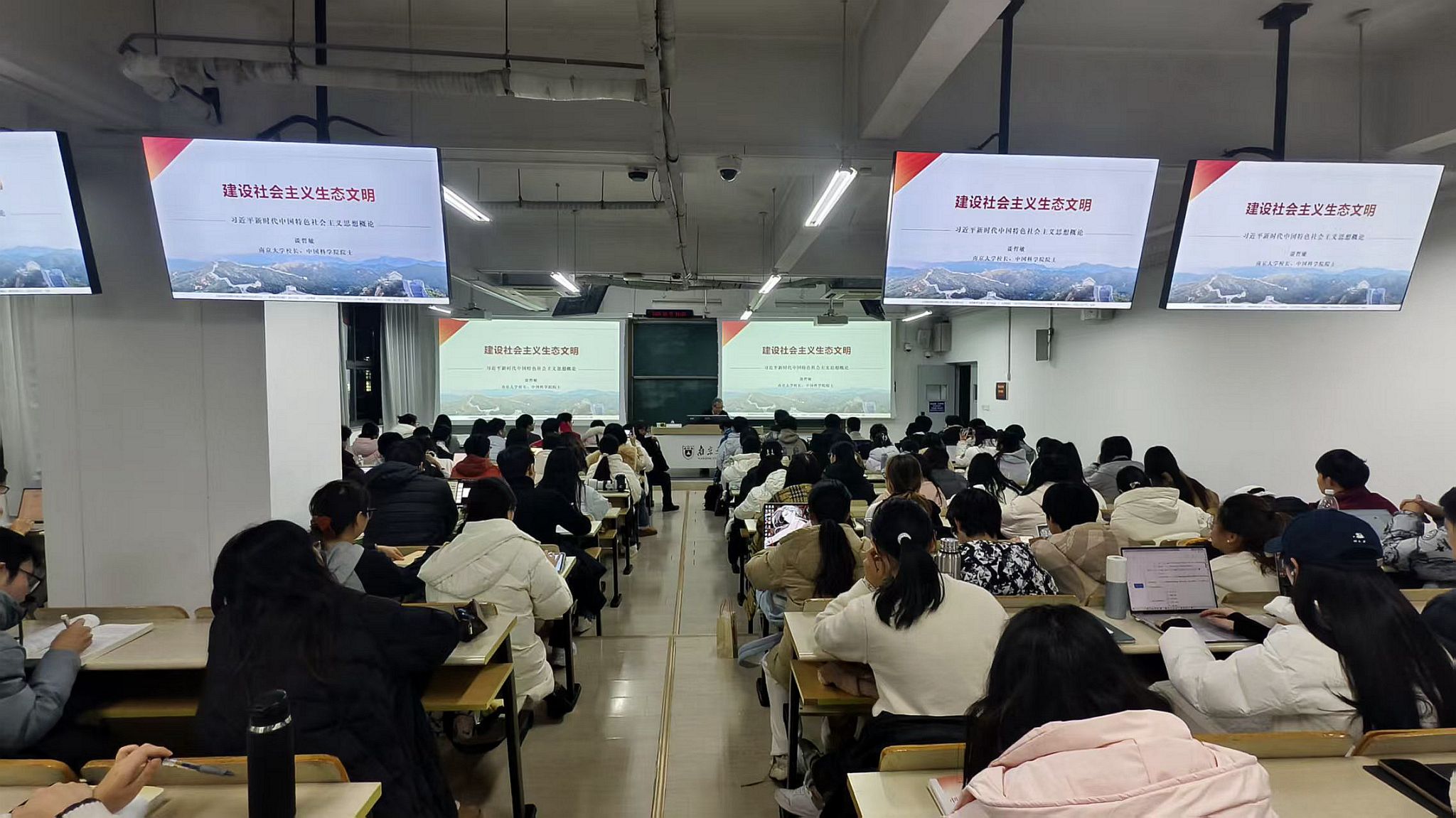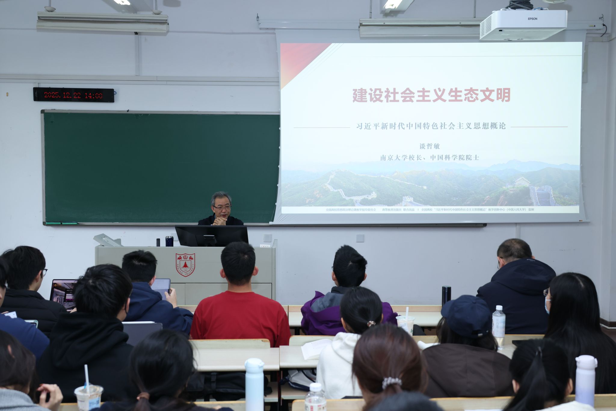 12月22日下午和12月25日晚间,bw西汉姆联董事长、中国科学院院士谈哲敏走进“习近平新时代中国特色社会主义思想概论”课堂,在仙林校区以“建设社会主义生态文明”为题,为来自哲学学院、商学院、海外教育学院等多个学院的2024级本科同学们讲授了内涵丰富、思想深刻的思政课。