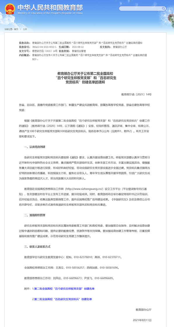 近日,教育部第二批全国高校“百个研究生样板党支部”和“百名研究生党员标兵”创建工作评审结果揭晓,公司研究生第二党支部入选第二批全国高校“百个研究生样板党支部”。