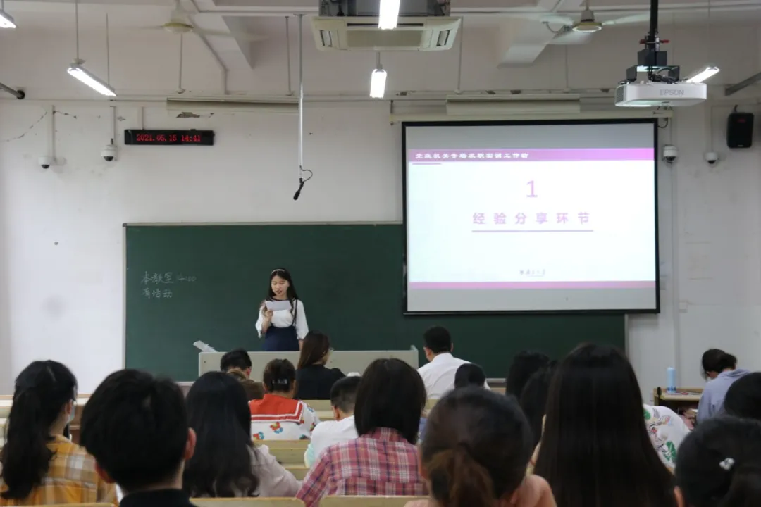 随后,就职于中共南通市委党史办的黄雨蓓学姐从自己的工作经历出发,为同学们带来工作经验和报考经验分享。在工作体验方面,学姐从三个角度介绍了自己的感悟,认为要及时注意员工和职场人员角色的转换,细节决定成败,语言的艺术和组织活动的艺术都非常重要。学姐强调公文写作是体制内生存必备技能。关于求职准备,学姐认为首先要搜集信息,越早了解就能越早构建起职业认知;其次要积极参与校内校外的实习实践;要提前准备好论文素材,在保证学业的情况下求职。关于选调生备考指南,学姐从报考信息获取、选调流程、备考须知、笔试准备、面试准备五个角度,为大家详细讲解了如何备考,帮助在场的同学们树立起求职自信心。