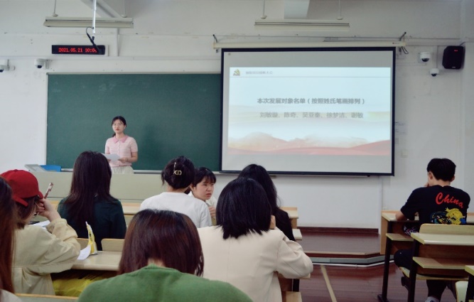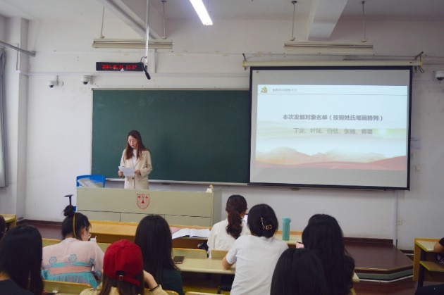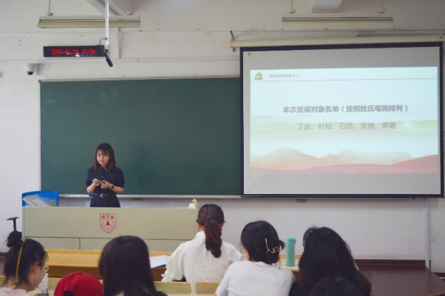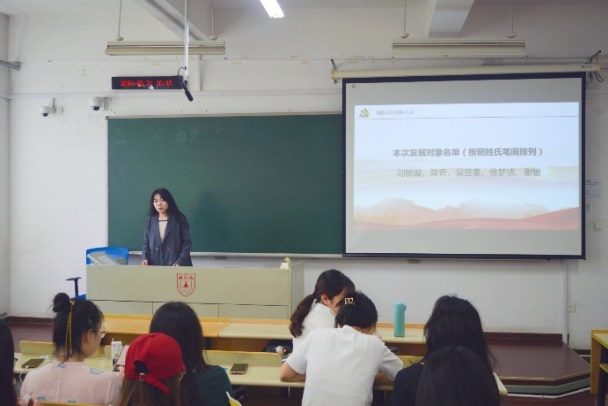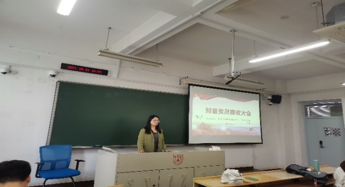 会议伊始,全体起立,奏唱国歌,党支部书记崔兴红汇报到会情况,简短介绍拟接收预备党员情况及程序。会上,第一党支部刘敏璇、陈奇、吴亚秦、徐梦洁、谢敏五位发展对象,第二党支部丁定、叶灿、白佶、张楠、蒋璐五位发展对象分别对党的认识、入党动机、本人履历、家庭和主要社会关系情况,以及需要向党组织说明的问题等方面作了简要报告,同时结合自身实际表达了加入中国共产党的坚定决心和强烈愿望。