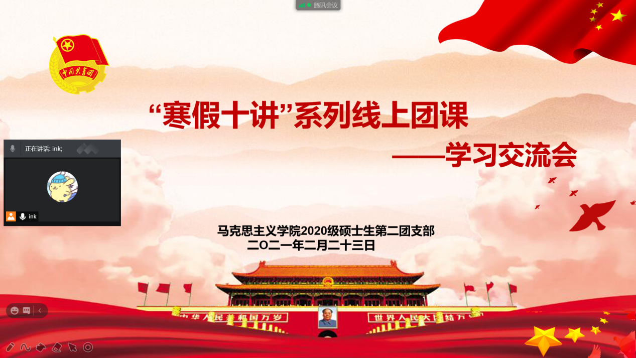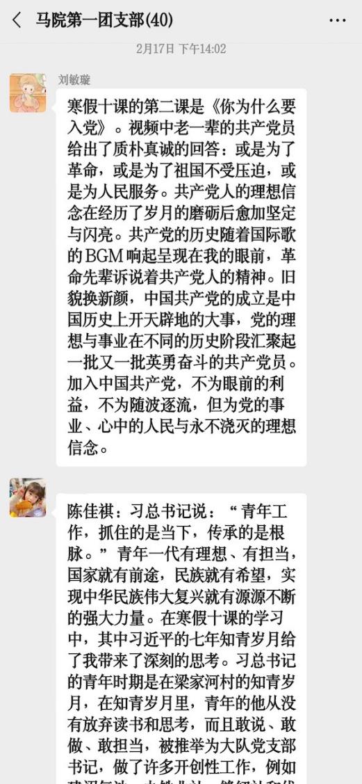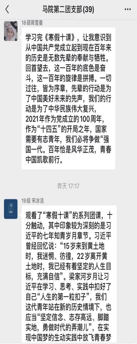 研究生第一、第二团支部通过微信群进行线上学习交流,支部团员撰写心得体会并进行分享。2020级硕士生第一团支部、第二团支部,2020级博士生团支部通过腾讯会议平台开展员工团员“寒假十课”学习交流会,支部成员结合生活实际、影视作品和家乡故事等内容,回顾“寒假十课”,分享学习心得体会。