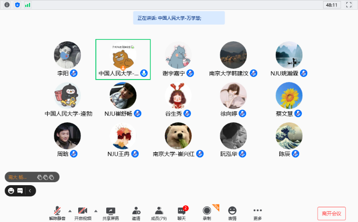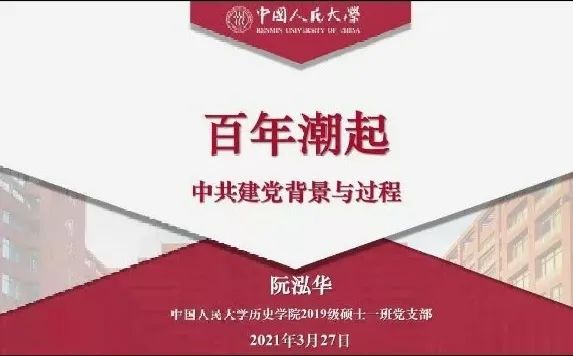 最后,中国人民大学历史学院2019级硕士生一班党支部书记万学慧对本次活动作总结发言,他表示两位同志的报告体现了历史与现实的呼应,两个学院的同学应相互学习借鉴,在历史研究中增加现实关怀,在时政分析增强历史底蕴;同时他也希望今后四个支部能加强沟通交流,以精品活动为载体,进一步提升支部党员党性修养,以优异成绩庆祝建党一百周年。