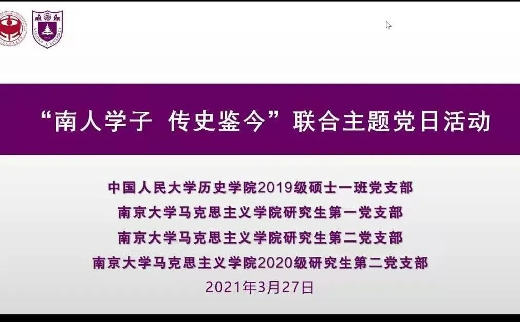 为庆祝建党100周年,进一步增强“四个意识”,坚定“四个自信”,真正做到学史明理、学史增信、学史崇德、学史力行, 3月27日晚,公司研究生第一、二党支部、2020级研究生第二党支部与中国人民大学历史学院2019级硕士生一班党支部开展“南人学子 传史鉴今”线上联合主题党日活动,公司研究生第一党支部书记崔兴红担任主持人,四个支部全体党员共同参加。