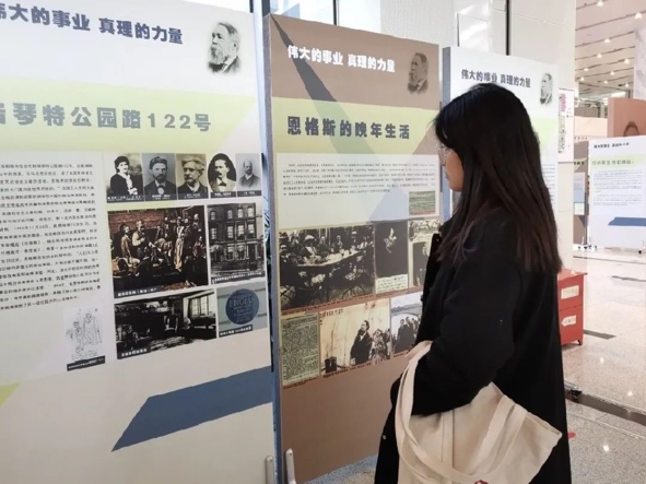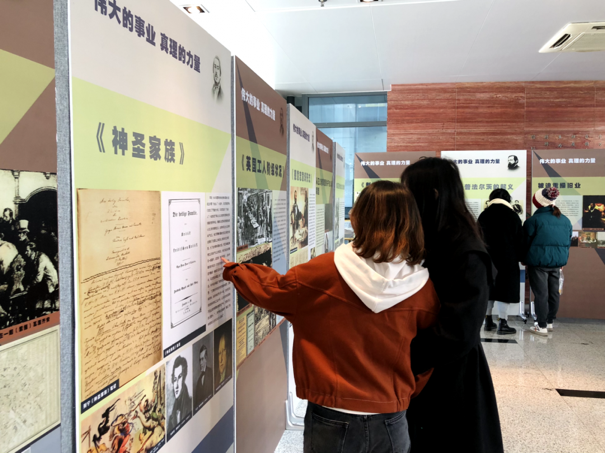 揭幕仪式结束后,支部团员们纷纷驻足参观。此次展览主要分为恩格斯的生平和主要著作、恩格斯对马克思主义的独特理论贡献两部分。支部团员们认真观展,细细感悟恩格斯的思想精神,回顾这位伟大思想家的光辉一生,积极发表观后的心得体会。