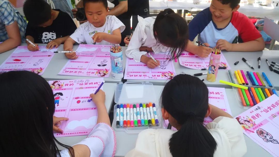活动步入绘画环节,在社区工作人员和公司志愿者的协助下,小朋友们纷纷拿起画笔,在卡纸上画起了心目中的母亲。他们全神贯注,时不时地举起画笔思索一会儿。大家的作品多姿多彩,一笔一划都饱含了对妈妈满满的爱意。“妈妈最喜欢吃的一道菜是什么?妈妈的生日是什么时候呢?”工作人员在画纸的其他位置设置了心有灵犀小游戏,小朋友们答得十分认真,仔细思考的同时也增进了他们对妈妈的关注和了解,整个活动现场气氛欢快且温馨。