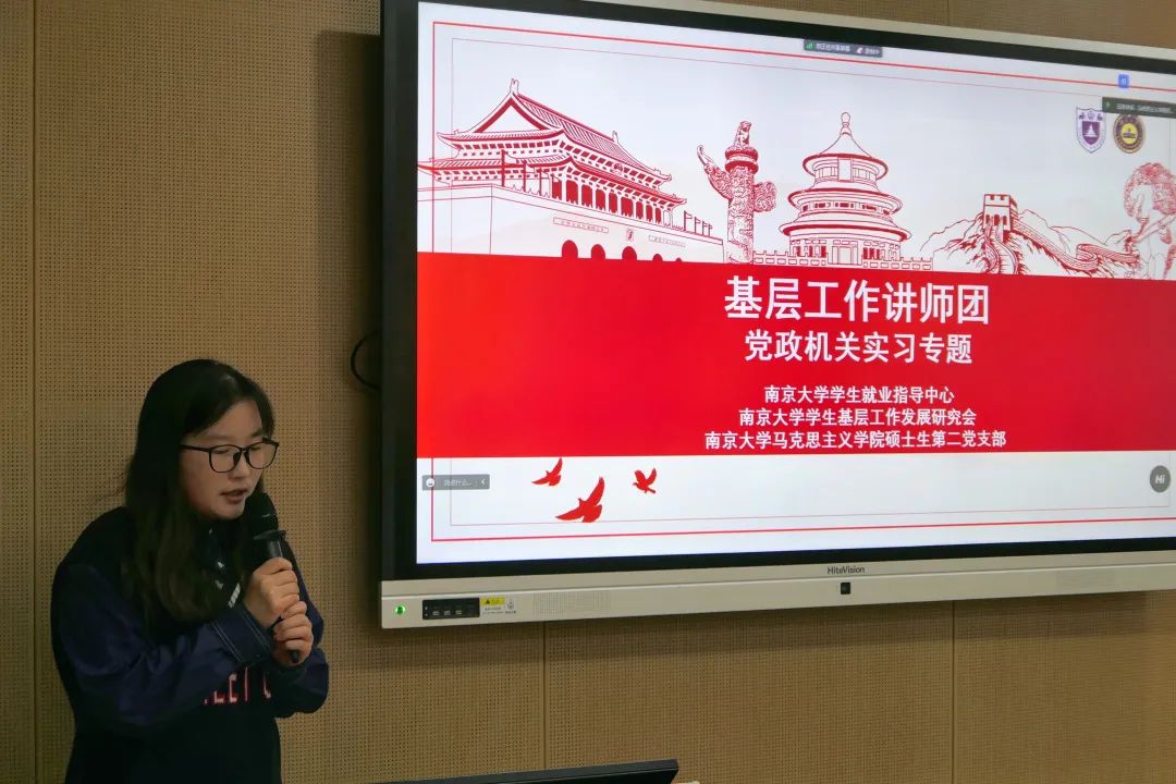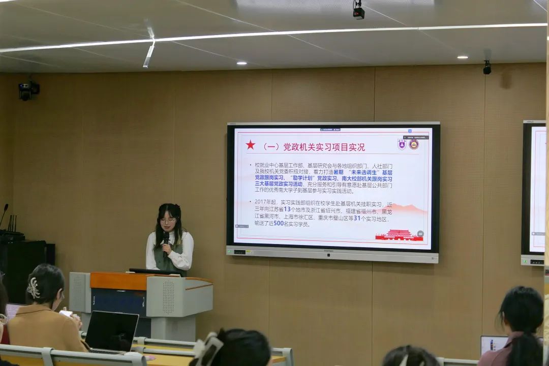 首先,由姜兴黔同学进行暑期党政机关实习项目介绍。校就业中心基层工作部、基层研究会与各地组织部门、人社部门及公司机关党委积极对接,着力打造暑期 “未来选调生”基层党政跟岗实习、“励学计划”党政实习、南大校部机关跟岗实习三大基层党政实习活动,充分服务和引导有意愿赴基层公共部门工作的优秀南大学子到基层参与实习实践活动。