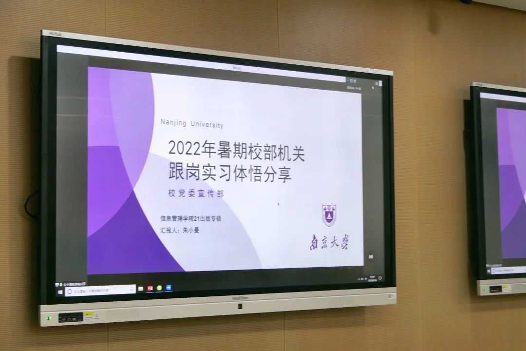 朱小曼同学围绕实习项目概况、工作内容与成果、挑战与学习、实习总结四个方面介绍了自己参加2022年暑期校部机关跟岗实习的经历。在工作内容与成果方面,线上线下相结合,采写编做均有涉及。线上主要针对媒体或院系采写好的新闻稿进行排版制作;线下主要进行新闻的采写报道。她还就实习中的挑战以及克服的方法进行了总结归纳,面对线上工作中自身的怠惰与拖延情绪,对线下情况缺乏感知的情况,应当加强与同组同学和跟岗导师的交流;加强对不同编辑器的转换与适应;关于原创设计中遇到的诸多问题,她建议同学在平日中积累原创的宣传创意,为日后求职做提前准备。在实习总结方面,她说虽然我们在具体实习过程中仅仅从事了工作中的冰山一角,但是在此过程中学习到的技能和经验是难以衡量的。