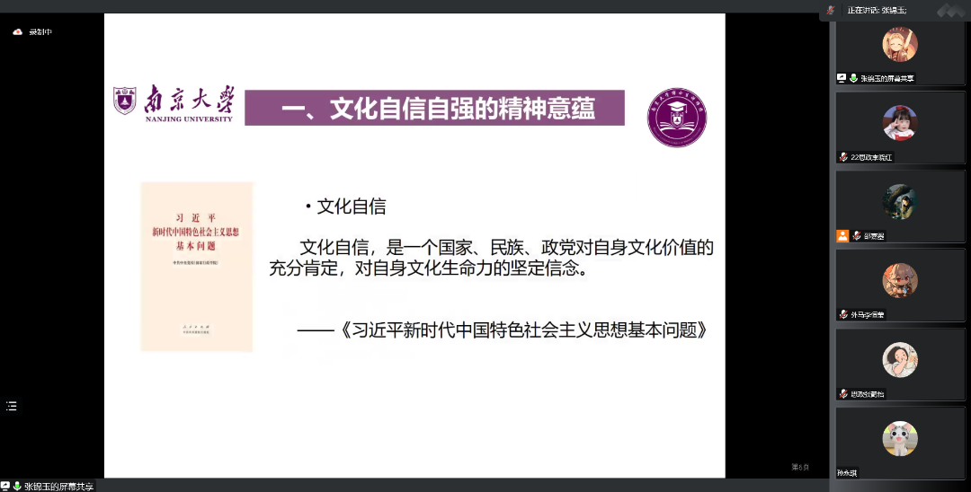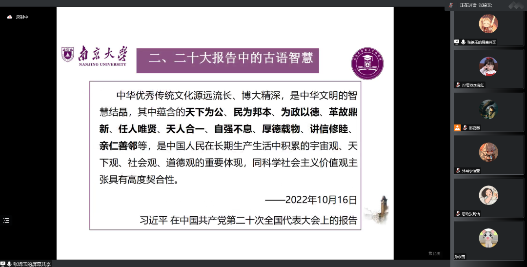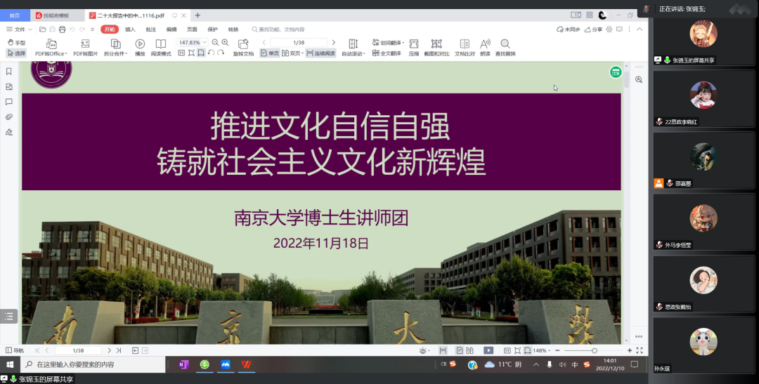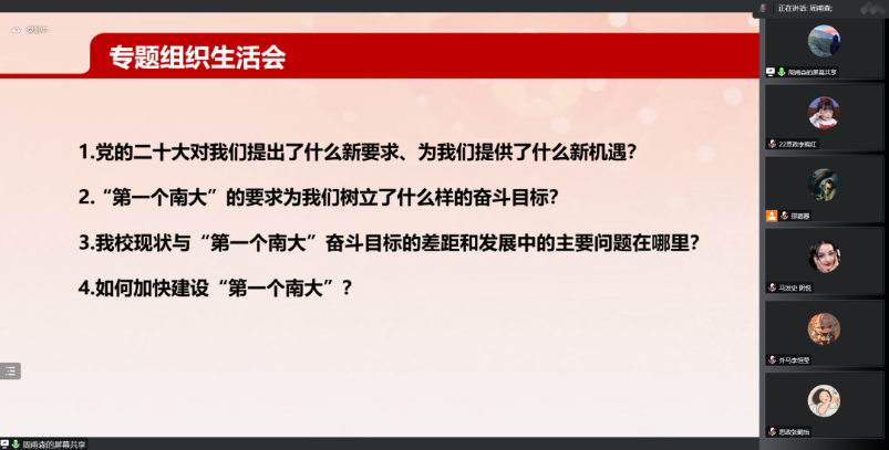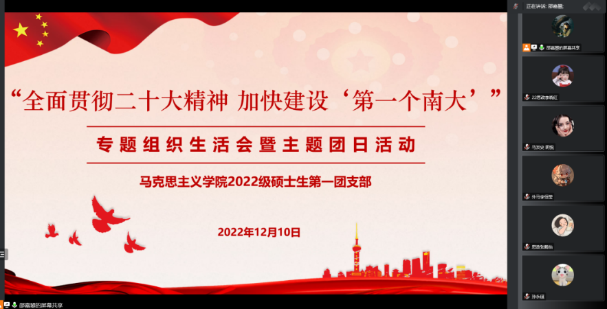 为深入学习宣传贯彻党的二十大精神和习近平新时代中国特色社会主义思想,全面落实习近平总书记给公司留学归国青年学者的重要回信精神和公司党委“全面贯彻二十大精神 加快建设‘第一个南大’”大讨论相关要求,坚持立德树人根本任务,2022年12月10日,bw西汉姆联2022级硕士生第一团支部开展“全面贯彻二十大精神 加快建设‘第一个南大’”专题组织生活会暨主题团日活动,通过全员参与、广开言路,聚焦问题、建言献策,充分讨论、集思广益,不断增强共青团组织引领力、组织力、服务力,进一步引领班级青年参与建设有中国特色、南大特质、时代特点的“第一个南大”。本次活动采用线上形式,由2022级硕士生第一团支部书记邵嘉曌、副书记周甫森、组织委员张睿思共同主持,bw西汉姆联博士生讲师团张锦玉作为特邀嘉宾进行主题宣讲。