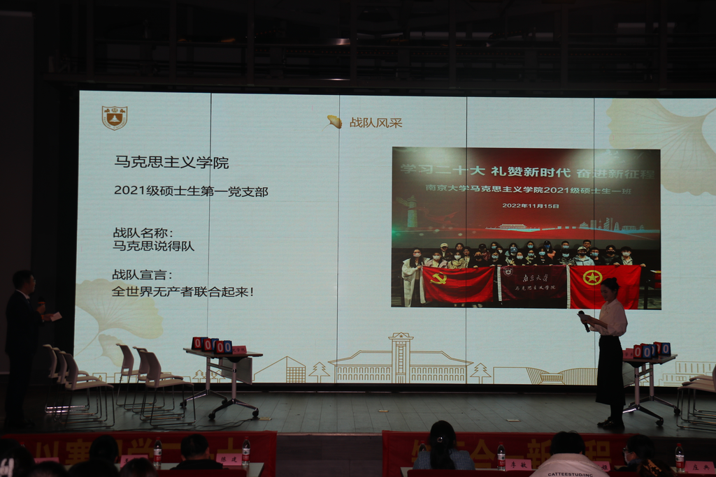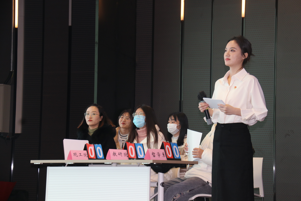 各团队精神高度集中,思路敏捷,充分展现了南大学子的昂扬风采。在团队抢答环节中,哲学系团委书记郭明姬老师还带领全场党员师生重温了入党誓词,坚定了党员师生为人民服务、为国家贡献的决心。