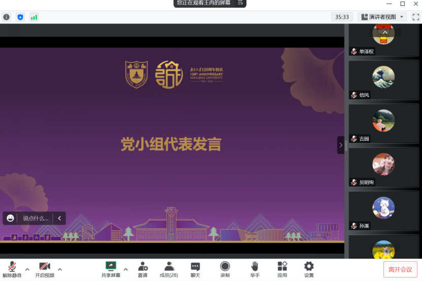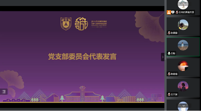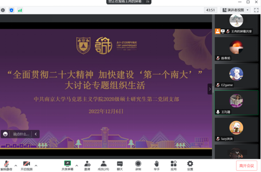 本次学习讨论会还有多位支部党员、团员代表们踊跃发言,纷纷结合学习党的二十大的精神提出了对“第一个南大”建设、学院建设中肯的建议。经过本次热烈而有效的讨论,2020级研究生第二党支部、团支部全体同学们形成共识:即使临近毕业,也必将为建设“第一个南大”贡献作为南大学子的青春之力。