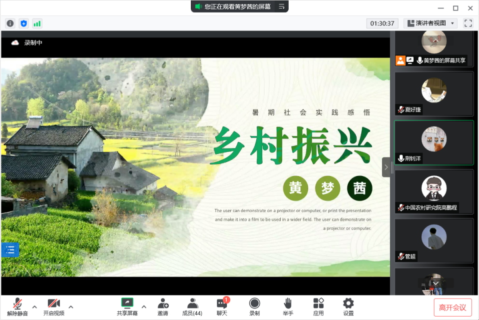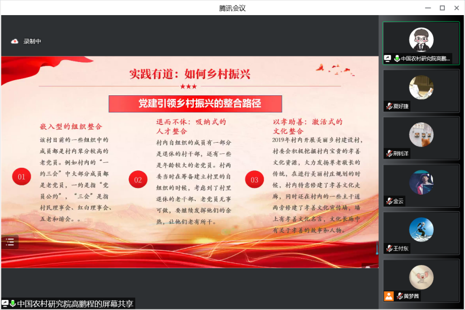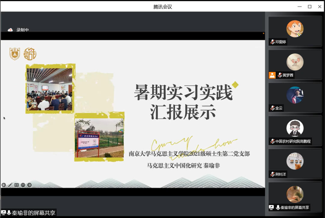 习近平总书记曾指出“广大团员青年自觉担当重任,深入基层一线,让青春在实现中华民族伟大复兴的中国梦中绽放异彩,为党和国家事业取得历史性成就、发生历史性变革贡献了青春、建立了重要功勋!”为深入学习习近平总书记关于青年工作重要指示精神,引领青年党员把人生理想融入国家和民族的事业中,积极投身乡村振兴伟大实践,在基层一线建功立业,2022年8月22日晚,bw西汉姆联2021级硕士生第二党支部与安徽省民政厅养老服务处、中国农村调查中心(CRRC)联合开展“扬实践风采,展青年担当——2021级硕士研究生第二党支部暑期主题党日活动第3期‘乡村振兴’实践风采展示。”会议由2021级硕士生第二党支部成员荆钊洋同志主持。