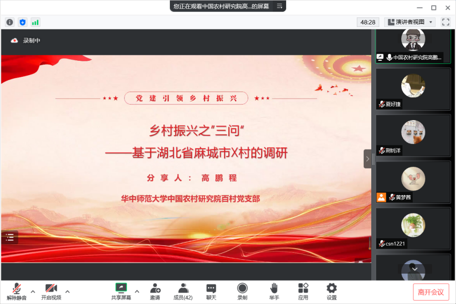 随后,由华中师范大学中国农村研究院乡村振兴十年寻访实践队成员高鹏程同志给大家做“乡村振兴之‘三问’——基于湖北省麻城市X村调研”主题宣讲。他基于在湖北省麻城市X村的调研经历与自身思考,指出乡村振兴要与脱贫攻坚成果相衔接,是实现共同富裕的“必答题”,即乡村振兴必须置于历史维度下去理解,并从“何为乡村振兴?”“为何乡村振兴?”“怎样乡村振兴?”这三问出发展开分享。