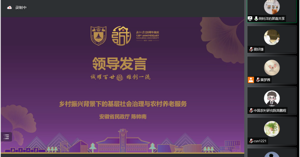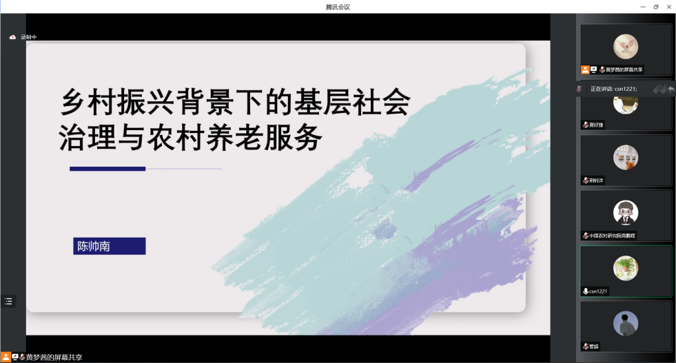 活动伊始,由历任安徽省民政厅政策法规处副处长、养老服务处副处长的陈帅南同志做“乡村振兴背景下的基层社会治理与农村养老服务”主题分享,他选择了乡村振兴、农村基层治理、农村养老服务三个主题,结合自身参与起草安徽省委乡村振兴相关文件的经历,围绕乡村治理和农村公共服务展开介绍。