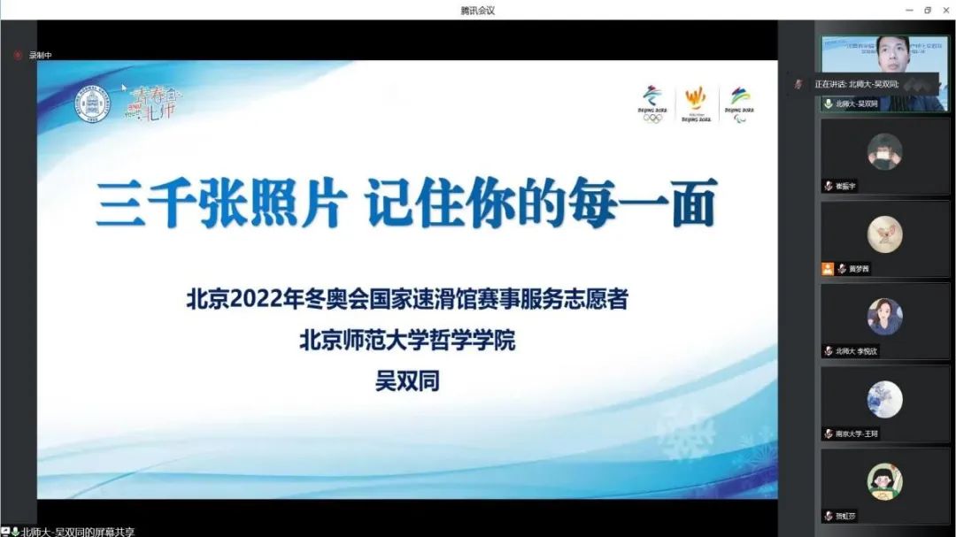 随后,由北京师范大学“冰雪有余情”北京冬奥会遗产转化实践队宣讲组两位成员进行了关于冬奥与志愿精神的相关主题宣讲。北京师范大学哲学学院的吴双同同志分享了自己在“冰丝带”国家速滑馆从事赛事志愿服务的经历,从冰丝带小管家、到赛事服务保障者、再到美好瞬间记录员,这一个个身份的转换,也为我们呈现出一幅青年志愿者的成长画卷,是践行“强国有我,请党放心”誓言的生动体现。北京师范大学经济与工商管理学院硕士生张艺源同志分享了自己作为北京2022年冬残奥会闭幕式演职人员的体会,她用“付出、温暖、无憾”三个词概括了自己这段难忘的经历。从开始的紧张排练,到闭幕式上的呈现,用付出和汗水为这次体验画上了完美的句点,受疫情影响无法回家过年,却也促成了在老师和大家关心下的别样春节。在不断努力下,张艺源同志终于实现了自己目标,正如她所言“一次次从零开始,一次次为了绽放而努力”。