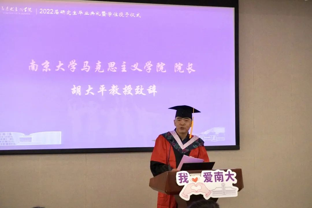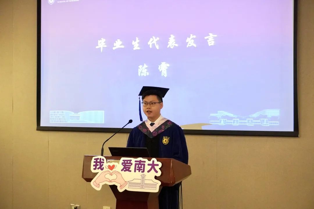 2019级中国近现代史基本问题研究专业硕士研究生陈霄作为2022届毕业生代表发言。陈霄带领大家重温了在南马的三年珍贵时光,“记得破冰时的才艺表演,铭记各位老师不厌其烦的教导呵护、参加学院组织的学术氛围浓烈、员工活动热烈的各项活动,在重要历史阶段参与为党献礼的微党课视频、微党课大赛”。人生最苦离别,值此韶华,不如迈向未来。最后他代表全体毕业生做出庄严承诺,必学有所成,不负师恩;迈步前行,砥砺奋进;扎根基层,报效国家!