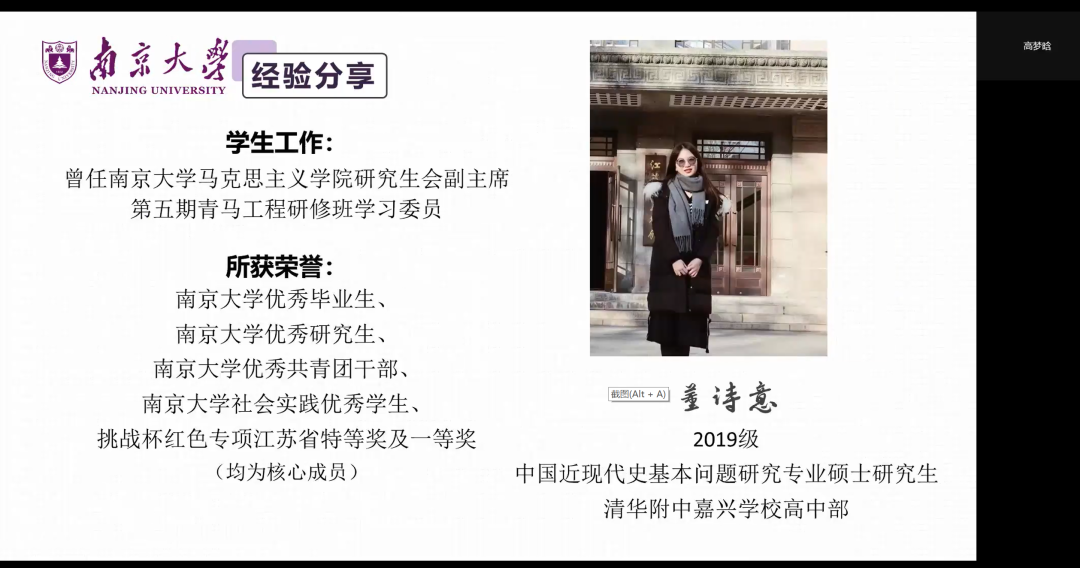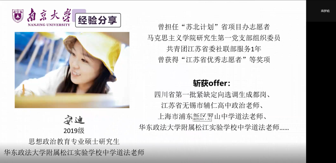为帮助有志于从事教育工作的马院学子深入了解中学教师的职业特性,拓展选择视野与择业认知,明晰中学教师的准入条件与备考方向,2022年4月28日晚19点,bw西汉姆联毕业生求职经验分享会之中学教师专场以在线会议的形式顺利举办。此次分享会共吸引来自各院系的50余名同学相聚云端,倾听学姐们选择中学教师职业的心路历程与经验分享。