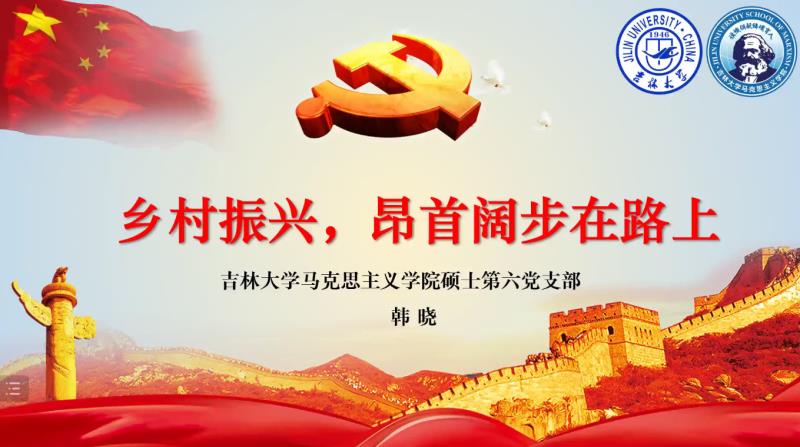 接下来是吉林大学bw西汉姆联硕士第六党支部代表韩晓同志发言,其分享主题是“乡村振兴,昂首阔步在路上”。韩晓同志由两会热搜话题入手,聚焦乡村振兴,号召青年同志们努力学习,成为乡村振兴的主力军。