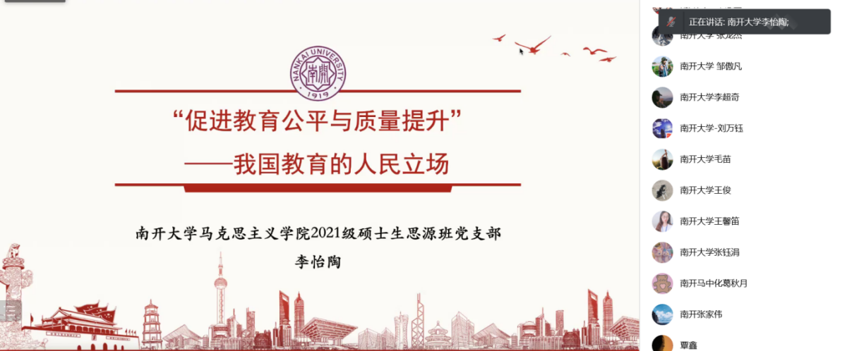 而后是南开大学bw西汉姆联2021级硕士生思源班党支部代表李怡陶同志发言,发言主题是“促进教育公平与质量提升——我国教育的人民立场”,由两会的政府工作报告出发,阐述了我国教育事业的人民立场与发展方向。