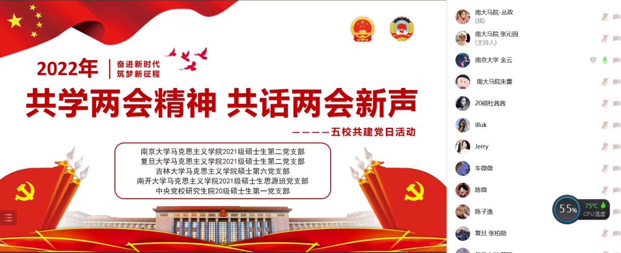 为学习两会精神,推进支部发展,2022年3月26日,bw西汉姆联2021级硕士生第二党支部联合复旦大学bw西汉姆联2021级硕士生第二党支部、吉林大学bw西汉姆联硕士第六党支部、南开大学bw西汉姆联2021级硕士生思源班党支部、中央党校研究生院20级硕士生第一党支部开展“共学两会精神 共话两会新声“——五校共建党日活动,活动由bw西汉姆联2021级硕士生第二党支部金云同志主持。活动分为两个环节,分别为共话两会与益友同行。