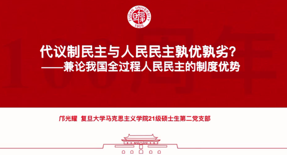 随后是复旦大学bw西汉姆联2021级硕士生第二党支部代表邝光耀同志发言,他的发言主题是“代议制民主与人民民主孰优孰劣?——兼论我国全过程人民民主的制度优势”。邝光耀同志通过对代议制民主与人民民主的对比,突出了我国人民民主的优势,增强了同志们对两会主题中全过程人民民主的认识。