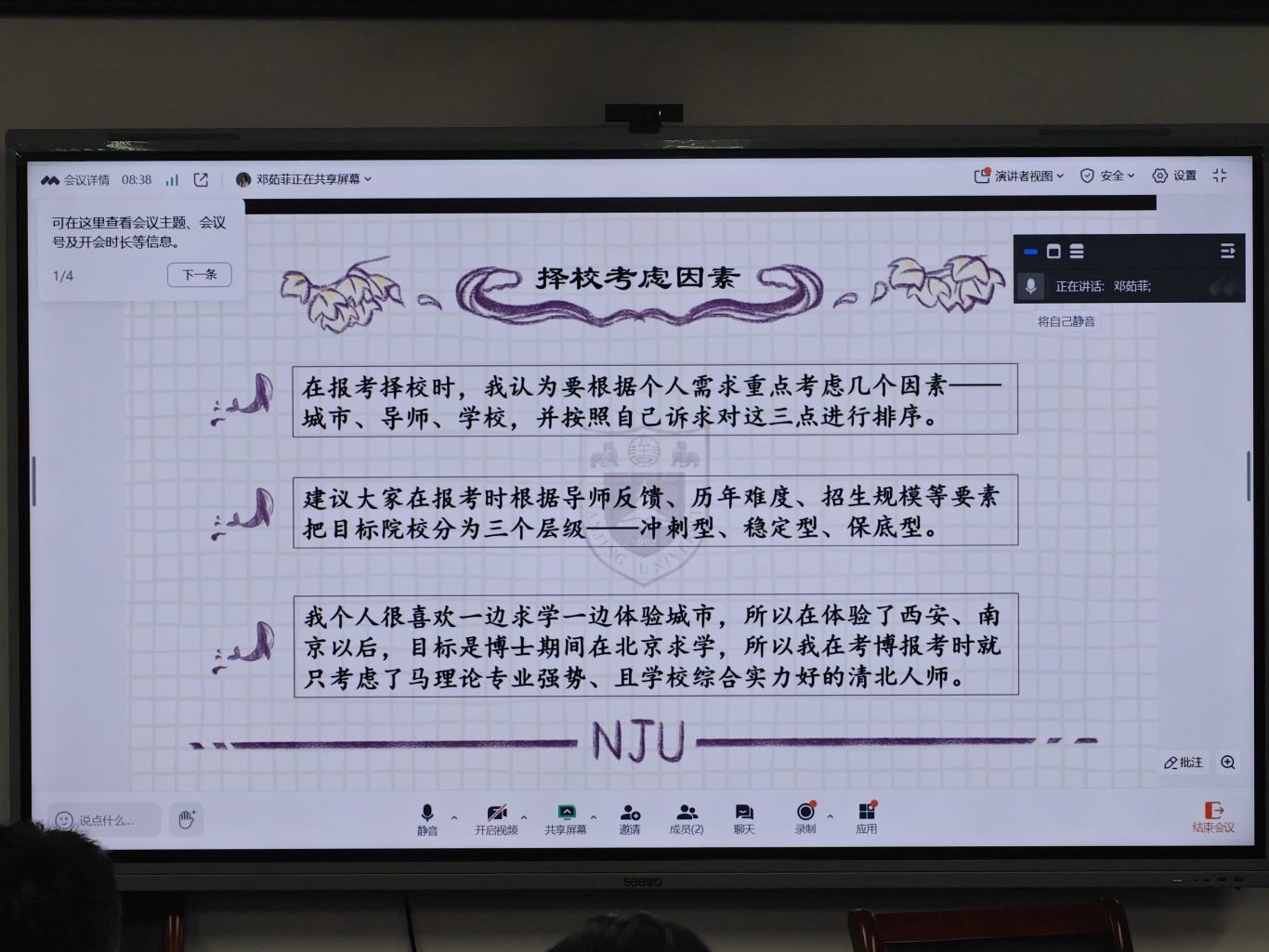 张鹤怡以自身跨专业申博的成功经验为核心,强调既要关注对自身学术能力、应试技巧的培养,也要注重材料准备的细微之处。在学术积累上,她分享了“经典教材+原著精读+真题导向”的递进式学习方法,即通过反复研读《马克思主义发展史》等教材,对照《德意志意识形态》等原著深化自身理解,并针对性地提炼目标院校真题高频考点。